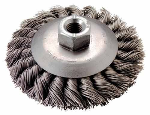 For heavy duty surface cleaning, rust removal, spatter removal and roughening. The Bevel Knot Wire Wheel is more aggressive than the Crimped Bevel Wheel. It is also used when the operator encounters uneven surfaces. Milwaukee offers both carbon and stainless steel wheels in this style of wheel. This Bevel Knot Wire Wheel is designed for use with 4-1/2 or 5 inch Milwaukee and competitive Grinders with 5/8-11 threaded spindles. Made of carbon steel.FEATURES: 4 inch. 5/8-11 thread. .014 ga wire. Carbon steel